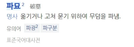 '파묘' 뜻 : 묘를 이장하거나 화장하기 위해 파는 것, 묫바람이 일어나면 파묘를 하기도 한다.