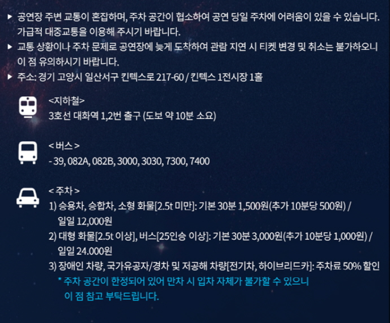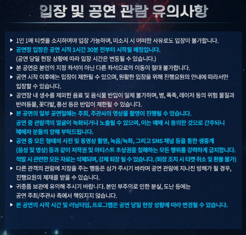 ** 티켓 예매 시 공연 안내사항에 동의한 것으로 간주하며, 본 내용은 상황에 따라 추가. 변경될수 있습니다. 공연 관람에 지장이나 불이익을 받지 않도록 관람 전 반드시 공연 안내사항을 재확인 바랍니다.