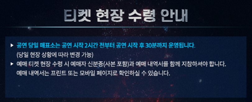 - 휠체어석 예매 티켓은 현장 수령만 가능하며, 공연 당일 예매자 본인(휠체어석 이용자) 이 직접 티켓을 수령해야 합니다. (대리수령 및 양도 불가)