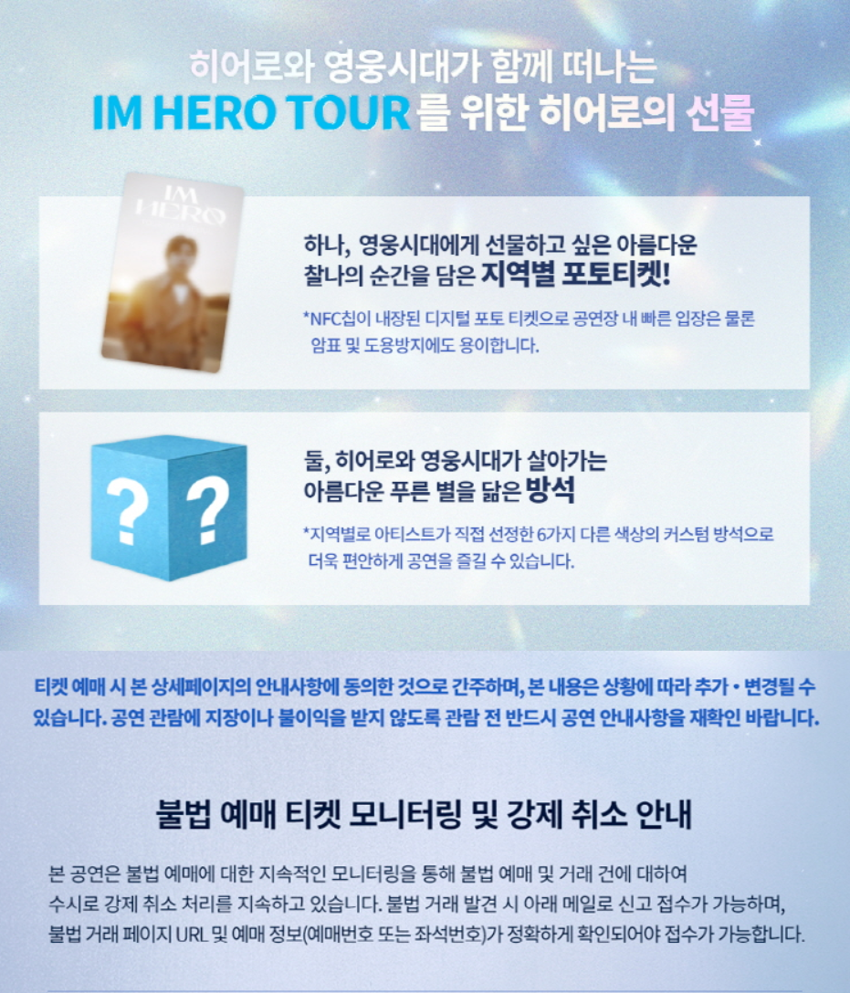 - 티켓 제작으로 인해 2023년 12월 26일(화) 23:59(kst) 이후 일괄 배송 예매 건의 취소 요천은 2024년 1월 4일(목요일-낮 12시) 까지 고객센터 (1544-1555) 또는 임영웅 전국 투어 전용 ars 고객센터 (1660-1646)을 통해서만 가능합니다.