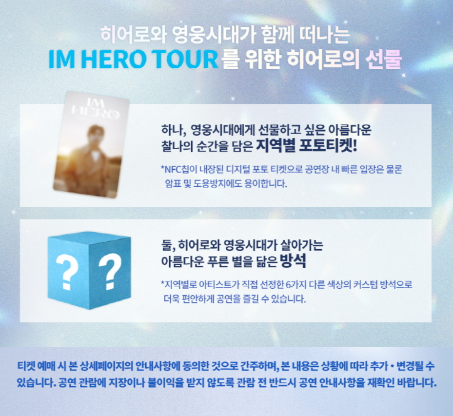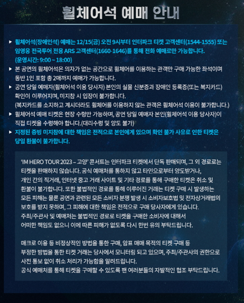 - 휠체어석 (장애인석) 예매는 12/15(금) 오전 9시부터 인터파크 티켓 고객센터(1544-1555) 또는 임영웅 전국투어 전용 ars 고객센터 (1660-1646)을 통해 전화 예매로만 가능합니다. ( 전화 예매 간으 시간 : 평일 9시~18시)