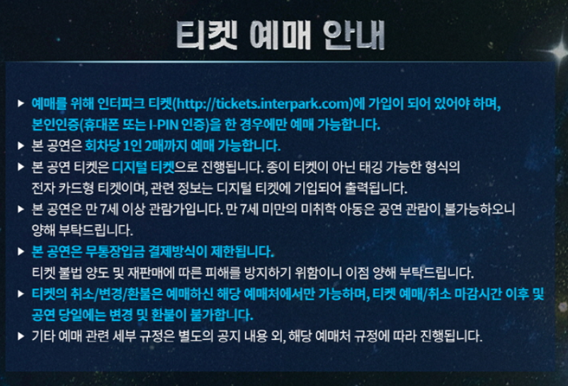 ** 원활한 예매를 위해 인터파크페이, 아이포인트, nol 포인트 결제 수단이 제한됩니다. ( 그 외 신용카드, 카카오페이 등 결제수단 사용 가능)