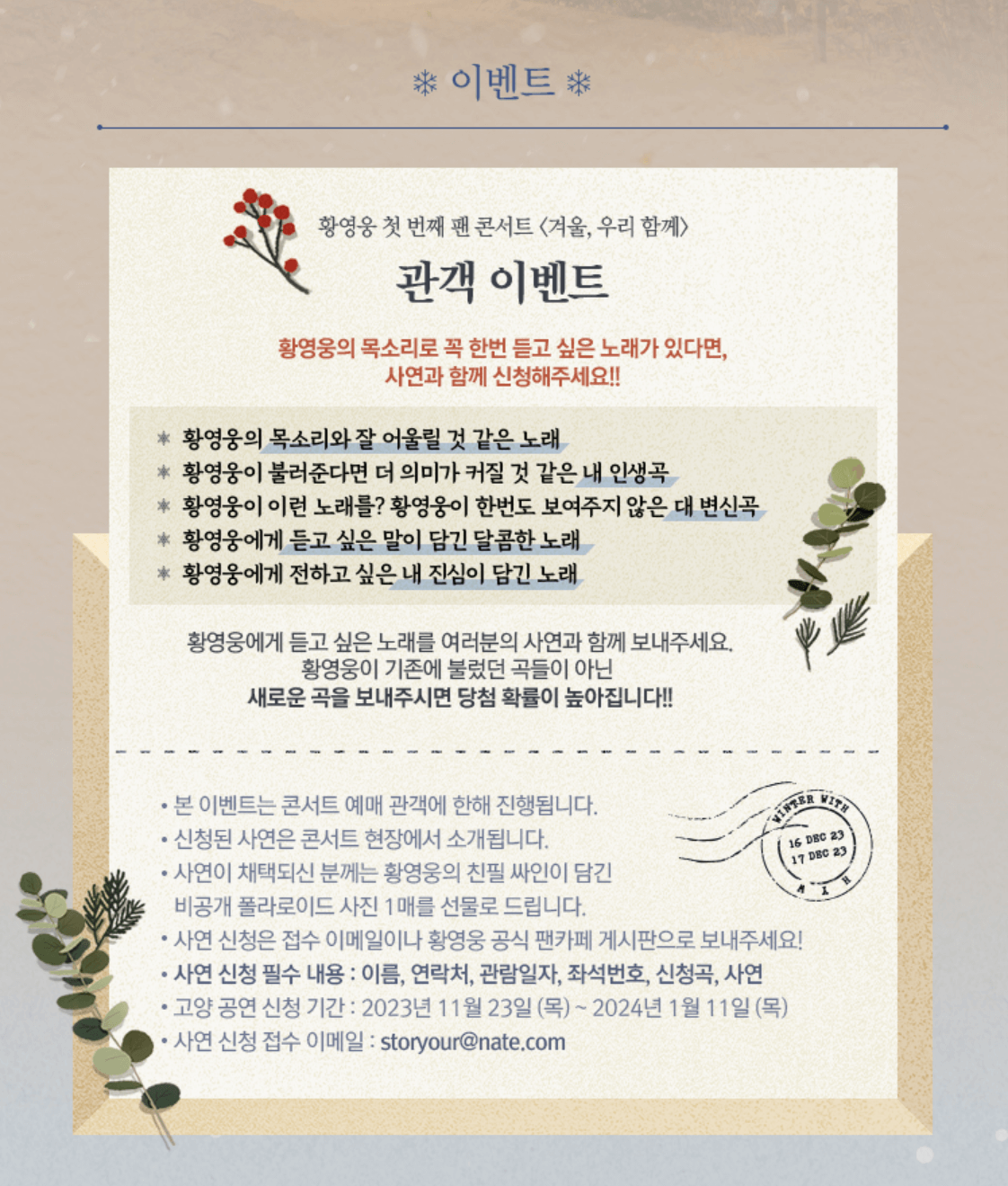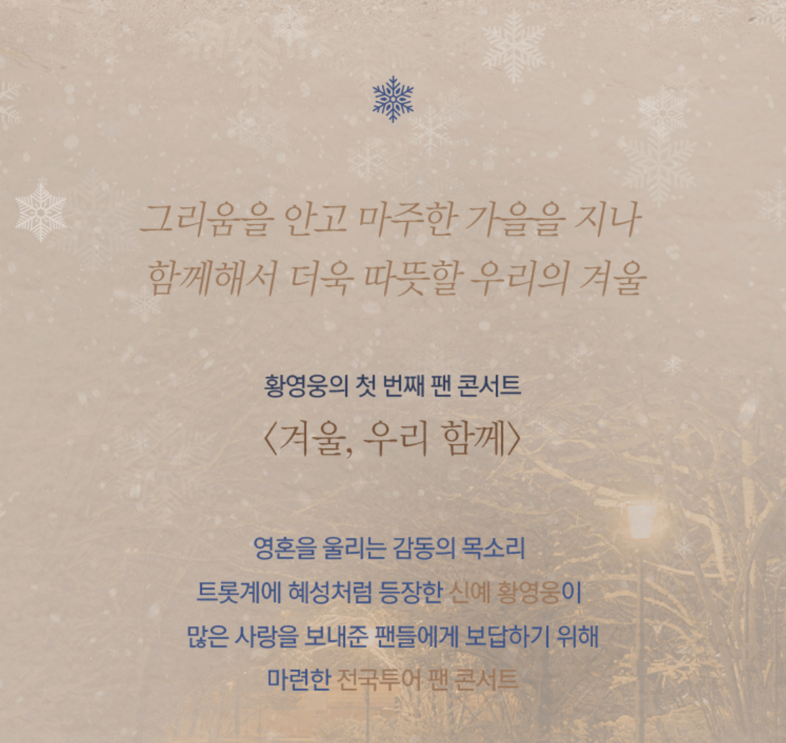 "황영웅 첫번째 팬 콘서트 <겨울, 우리 함께> ' 는 축하 화환 (꽃, 쌀, 연탄 등 일체) 및 화분은 정중히 사양합니다. 공연장으로 배송되는 화환은 일괄 폐기되는 점 양해 부탁드립니다.